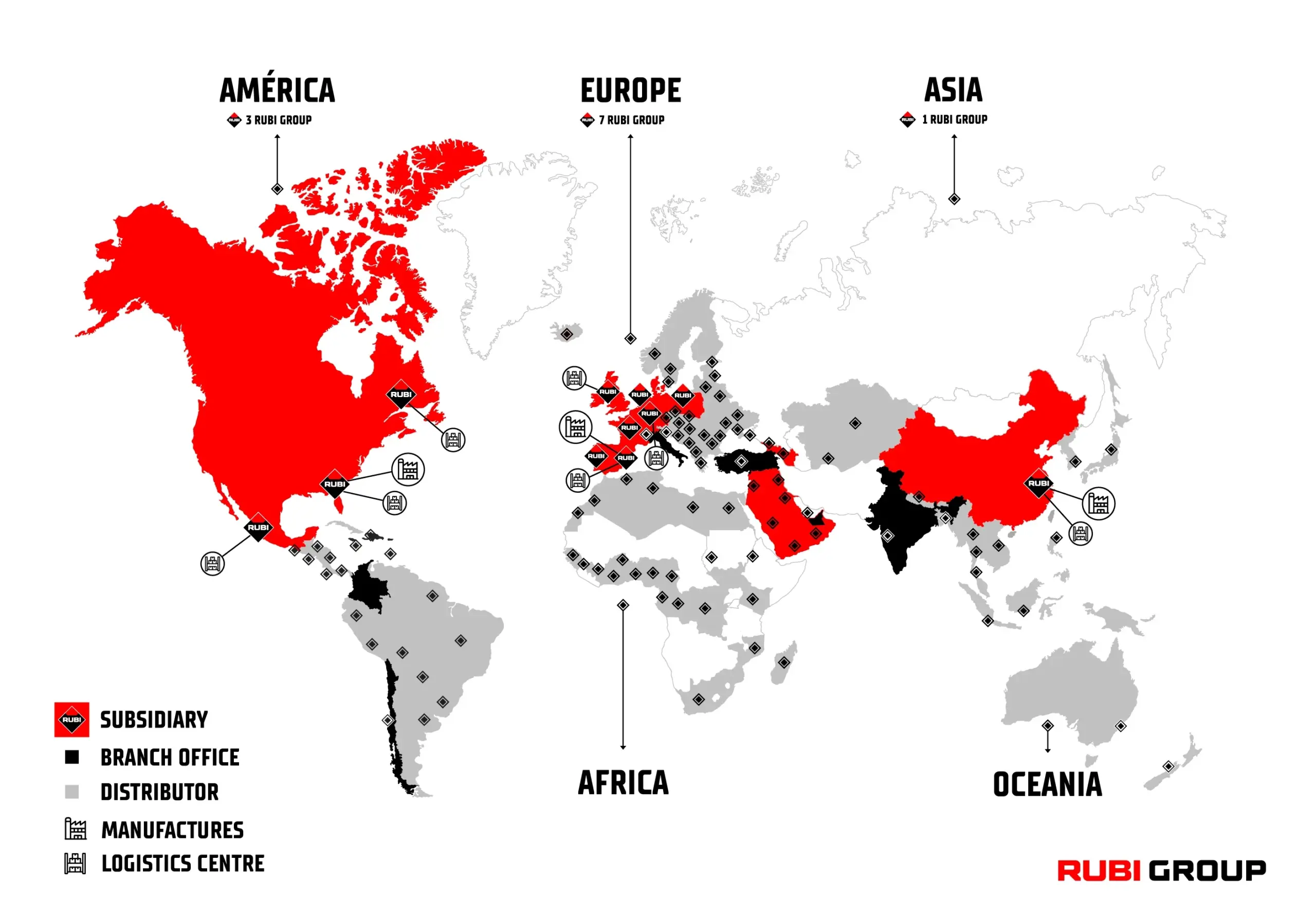 บริษัทย่อยของ RUBI จำนวน 11 แห่งทั่วโลก รองรับความต้องการระดับสากล พร้อมทั้งให้การฝึกอบรมและบริการหลังการขาย ร่วมกับผู้จัดจำหน่ายที่เชื่อถือได้ ทำให้เราอยู่ใกล้ชิดกับผู้ใช้งานเสมอ และสามารถนำเสนอแนวทางแก้ไขที่เหมาะสมกับลักษณะเฉพาะของแต่ละตลาดได้อย่างแท้จริง