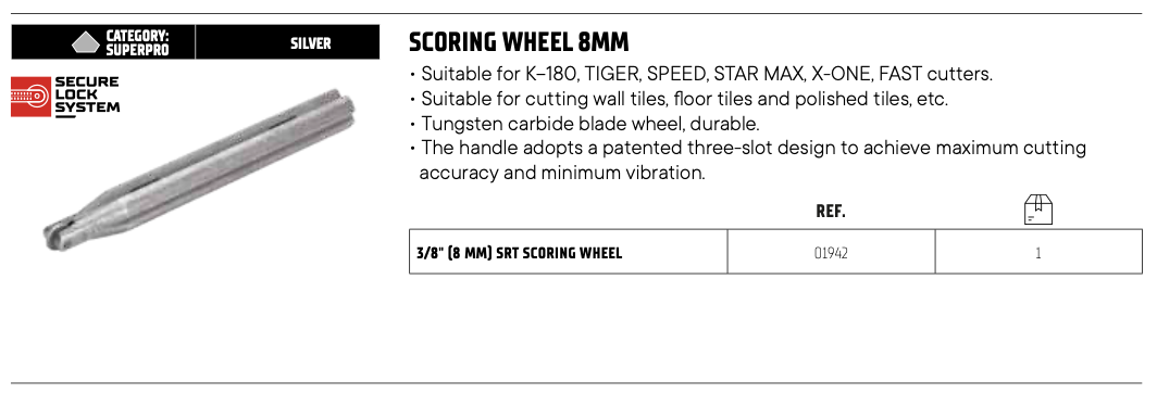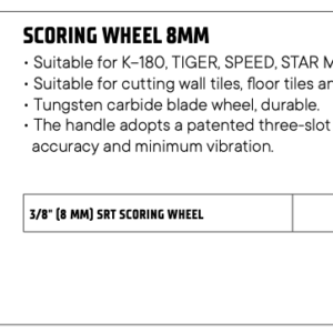 – ใบกรีดคาร์ไบต์ 8 มม. (5/16″) เหมาะกับกระเบื้องเซรามิค / พอร์ซเลน / stoneware ที่พื้นผิวเรียบหรือมีผิวธรรมชาติเล็กน้อย