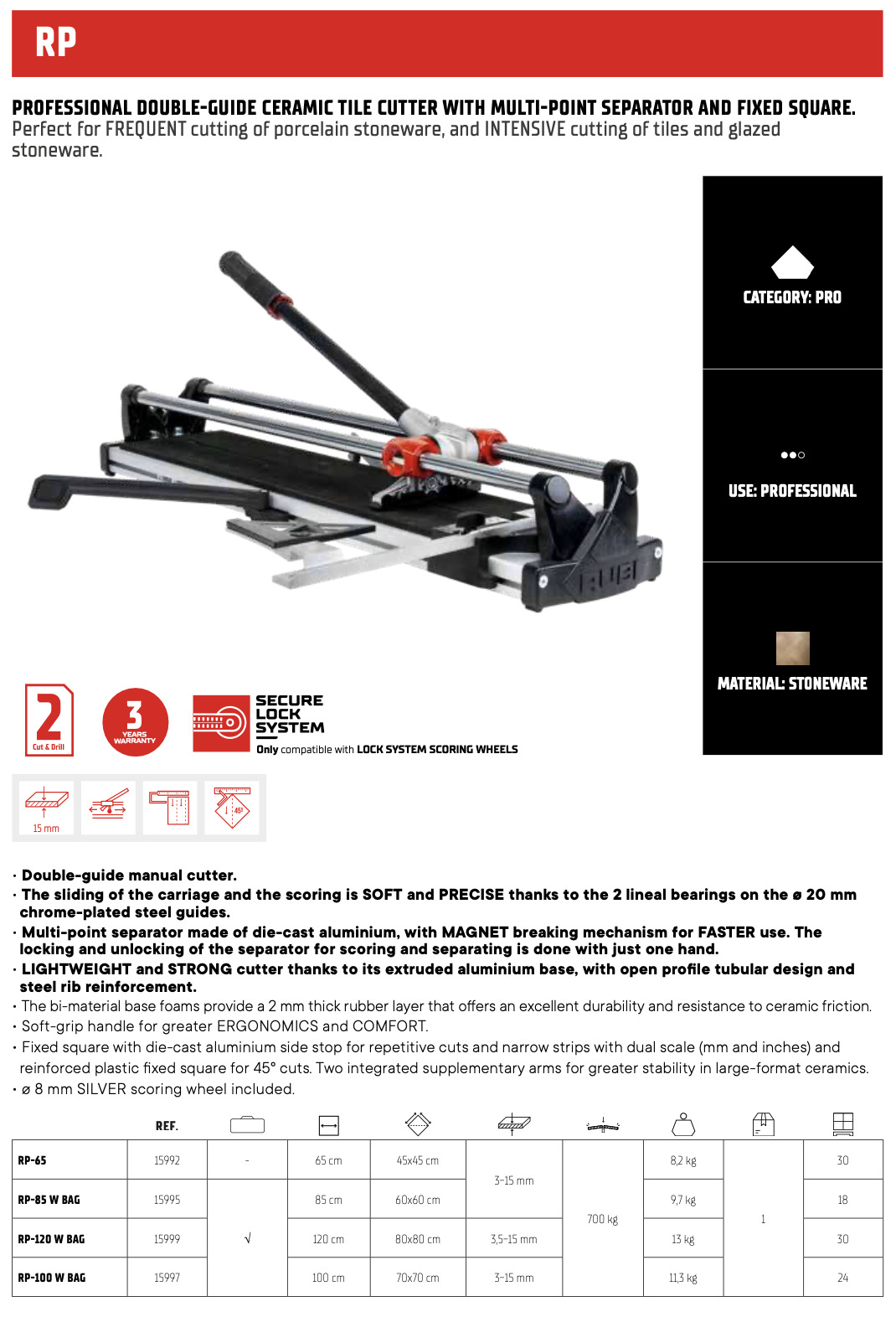 – ตัดกระเบื้องได้ยาวถึง 65 / 85 / 120 ซม. รองรับกระเบื้องแผ่นใหญ่พิเศษ