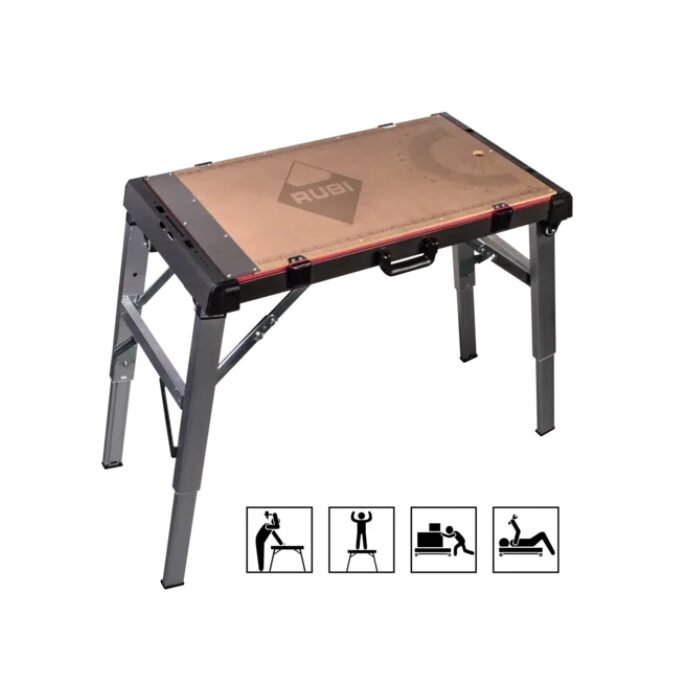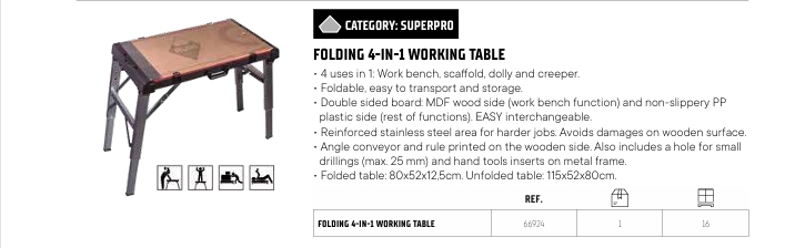 – โต๊ะทำงานอเนกประสงค์ 4 รูปแบบในหนึ่งเดียว — ใช้งานได้ทั้งเป็นโต๊ะทำงาน (Work Bench), นั่งยกสูง (Scaffold), รถเข็นของ (Dolly) และแท่นเลื่อน (Creeper)